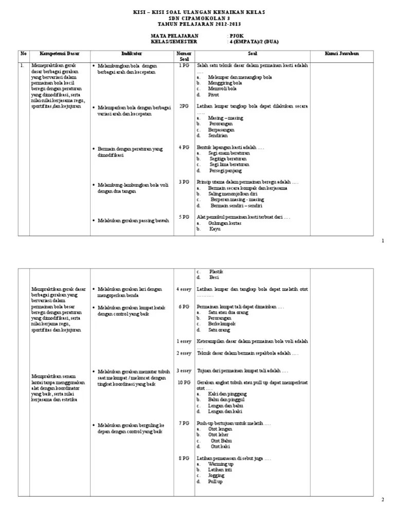 Ini merupakan kumpulan soal uts/uas/ukk penjaskes kelas 3 sd/mi yang sudah disusun sedemikian rupa sehingga bisa didownload dengan gratis pada link dibawah ini : soal penjaskes kelas 4 semester 2 dan kunci jawaban 2017. soal ujian penjas semester 1 kelas 4 add to my workbooks (0) download file pdf embed in my website or blog add to google classroom add to microsoft teams share through whatsapp Kumpulan soal soal latihan ulangan uts kelas 4 semester 1 terbaru kurikulum ktsp 2006. Adapun soalnya sebagai berikut : Berikut ini adalah contoh soal uts pts tema 2 pjok kelas 4 semester 1 k13 revisi 2018. soal pat pjok kelas 4 dan jawabannya i part 4. Contoh soal dan jawaban penjas kelas xii semester 2 dalam bentuk essay, berisikan materi tentang sepak bola. We did not find results for: Materi jenis cedera dan cara penanggulannya. Salto, meroda atau radslang dan kombinasi senam ketangkasan. Penjelasan proses terbentuknya batuan beku. Pada saat bermain kasti anak anak merasa.